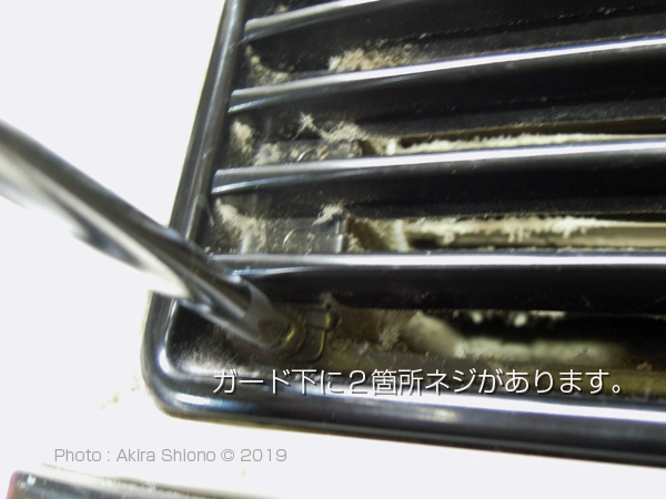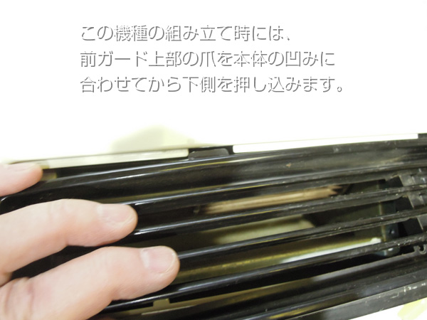 プラスドライバーでルバー型の前ガードを止めてあるネジを外します。(この機種の場合は、下に2本ありました。)下のみ2本のネジの場合は、上に引っ掛かける場所があります。外す際には下側を引き出した後に、下側に引くように外します。手前に無理に引っ張ると、本体にある爪を曲げてしまいますのでご注意してください。