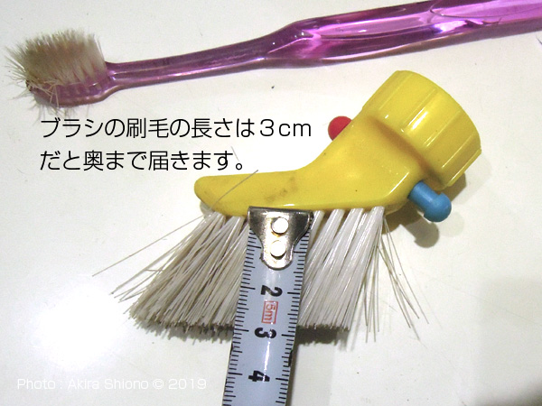 ![]() しぶとい汚れなので、歯ブラシを使って掻き出します。ブラシの毛足は長いとしっかり取れます。