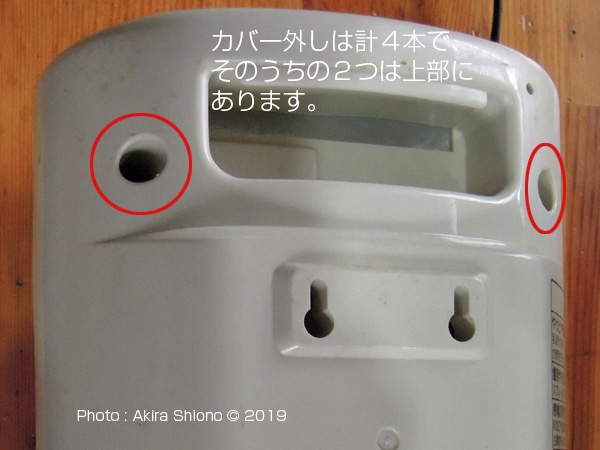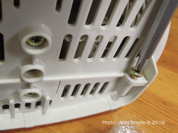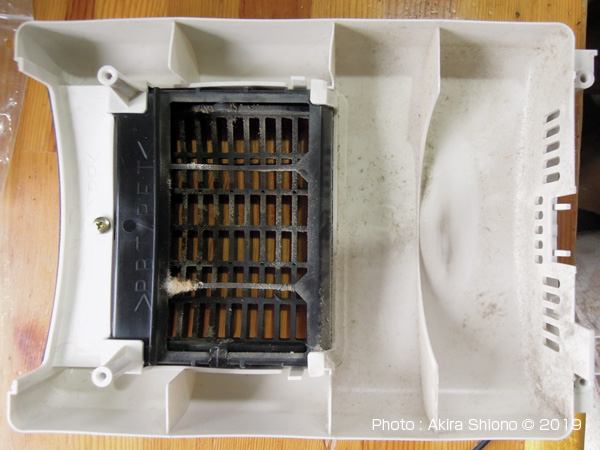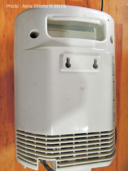 この電気ファンヒーターの分解はネジが4本です。上の画像にありますように、本体裏上部に2本のネジと本体底側に2本のネジがあります。大きなワタボコリを取り除いた左の画像が内部の状態です。間違ってファン固定用のネジが間違って外されています。比較的大きな綿埃があった原因は、この製品には、細いスリット状の空気取り入れ口が広い面積にありますが、フィルターの設置がありませんでした。これでは棉埃が吸い込まれていたのも頷けます。 外側のカバーの取り外しと清掃 トップへ