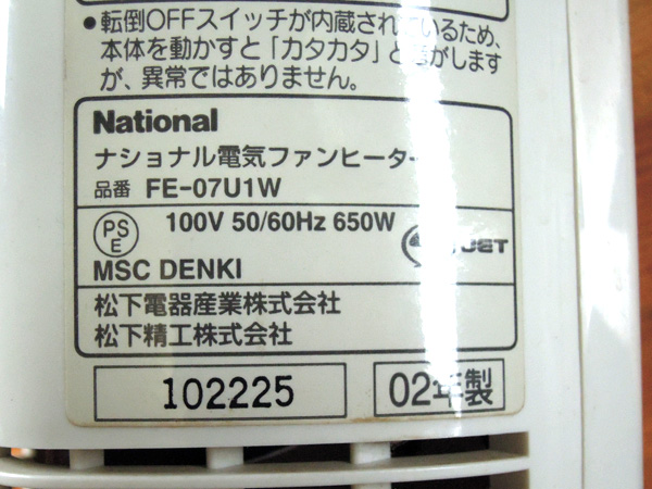 こちらは2002年製のNational(現Panasonic)のポカレットの電気ファンヒーターです。使用中に焦げ臭い匂いの温風が出るとの修理依頼がありました。コンセントに繋いで見て運転して見るとかなりホコリが焦げているような匂いがしました。周りを見回して見るとこの小型温風機にはフィルターがありませんでした。とにかく内部の清掃をすることにしました。分解する前は感電防止のため、コンセントは抜いてから行なってください。