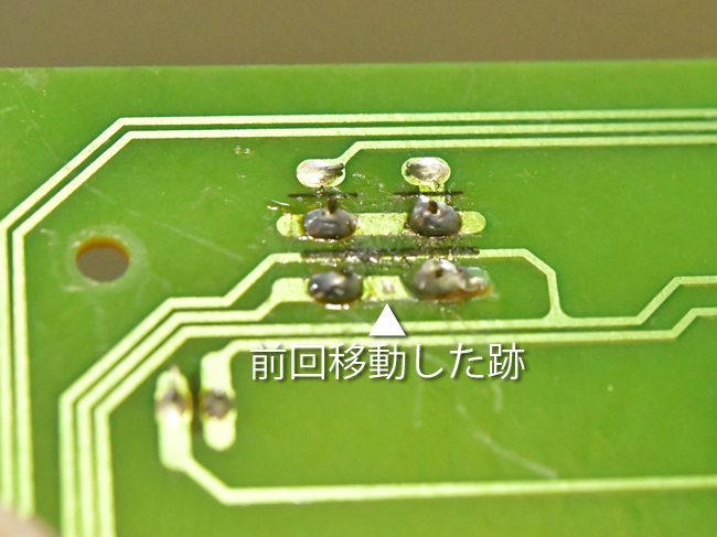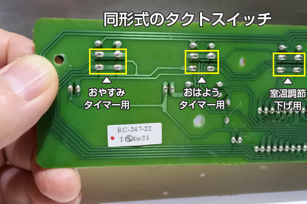 上の画像がガスファンヒータの上面パネル内の電子基板のウラ側で、黄色の枠がタクトスイッチがハンダ付けされている箇所です。間隔が違う4つの足が見えます。ご覧の通り足の間隔が違い運転スイッチは離れていますので、間違えがありません。本体上面のスイッチパネルを確認しながら、取り外すスイッチはどれなのかを決めます。