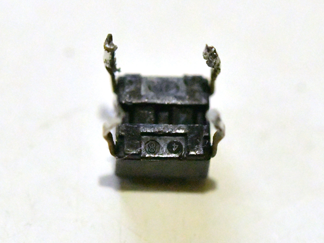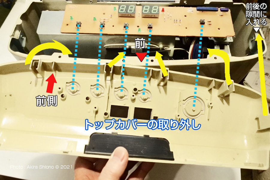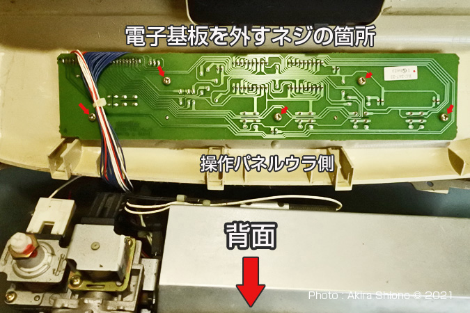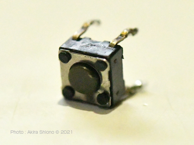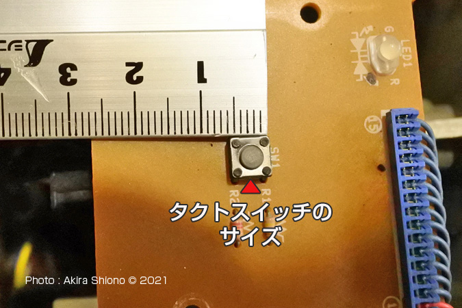 今まではここで寿命か・・と考えましたが、分解して調べると電子基板にはマウスにスイッチなどにも使われている、押すとスイッチの入切ができるタイプ「タクトスイッチ」というものが使用されていました。これを交換すれば復帰する可能性があります。 分解して電子基板を確認します。 トップへ これからの作業は自己責任で行ってください。作業経験の無い方は、買い替えしてください。