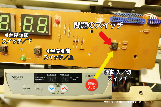 まず作業する前に、ガス漏れしない様にス元栓を止め、また感電しない様にガスファンヒーターの電気コードを外しておきます。 摩耗したスイッチの場所を探す トップへ 2019.10.19に分解掃除した後、現在もエラーを起こすことなく快調に燃焼してくれています。しかし1年3ヶ月過ぎた頃から、清掃をしていない電子基板の運転スイッチの作動がおかしくなりました。このスイッチは、様々な電子機器で使われている押すタイプのボタンスイッチに使われている「タクトスイッチ」です。形状は密閉型なので、清掃は難しいと考え部品の交換を考えないといけないと考えました。 応急処置:本体装着の未使用のタクトスイッチを移動する トップへ