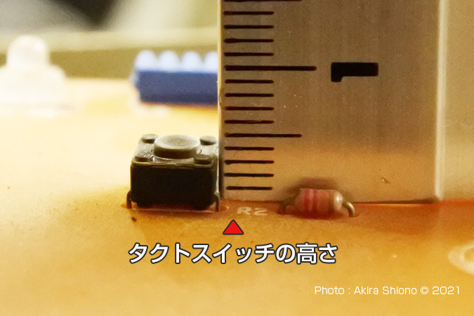 操作パネルには操作ボタンが5つあります。そのうち運転 入/切、室温調整 上/下、おはようタイマー、おやすみタイマーとなっています。分解して操作パネルをみると同じタクトスイッチがこの分の5個ついています。本来ならば、同じサイズのタクトスイッチを手に入れて取り付ければいいのですが、同じ6㎜サイズでも高さが色々あります。間違って買うものと面倒なのでちょっと考えてみました。