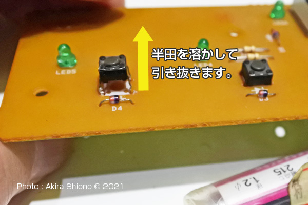 抜き取ったタクトスイッチの穴は、ハンダで塞がる場合があります。この時は、錫取り器があれば作業がスムーズに進みます。ない場合は電子基板の表側からスッチの4つの足を表側の穴に当てながら、基盤側のハンダを溶かすとズッズと入ります。完全に基盤に奥まで入ったら、ハンダで脚と基盤を改めて溶着します。 半田付け道具をAmazonで見る