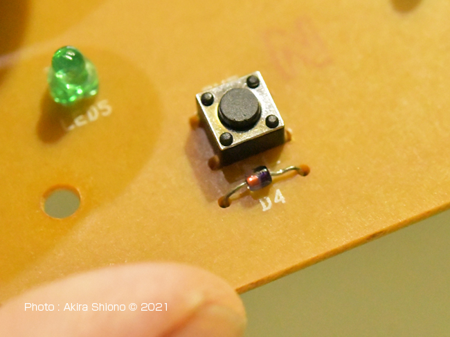 応急処置で交換してあった古いタクトスイッチを新品と交換しました。こちらのスイッチは1時間で切れるタイプのおやすみスイッチで、消火の5分前にはLEDが点滅する様になっています。