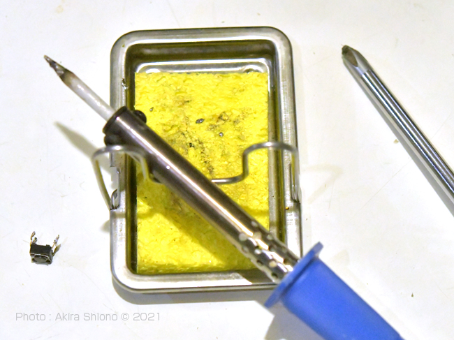 摩耗の少ないタクトスイッチの足を整えて基盤の場所に当てます。裏側からハンダゴテで、残っているハンダを溶かしながら穴を回復させます。溶けてきたら足を基盤の元の穴に通します。さらに温めながらタクトスイッチを押すと「ブッスッ」と入りますので、基盤のハンダを確実に溶かしハンダが足りない時は追加します。取り外してある不調のタクトスイッチを「おやすみタイマーの位置」にさしてハンダ付けしておきます。 新しいタクトスイッチの置換え