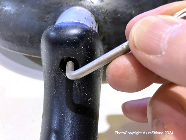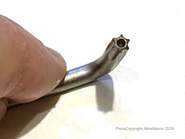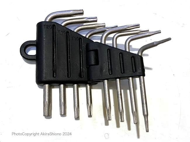 製品にもよりますが、比較低価格のものは鍋本体に2〜3本リベットで止められています。上級製品では、そのリベットが調理や洗浄時に邪魔になったりします。この様な製品は本体に突起を付けそこにネジ山を切って、ハンドルをねじ止めされています。 特殊な形状のヘックスローブレンチ トップへ 一般家庭の工具箱には、まず入っていない特殊工具ヘックスローブレンチですが、このT-fal には、このセットの内の一番大きいT20という物が使われていました。