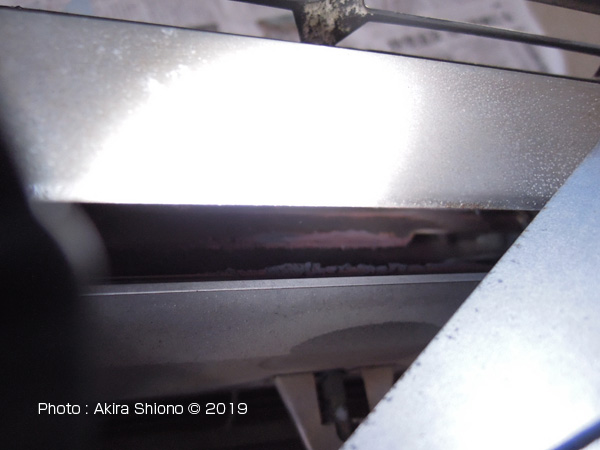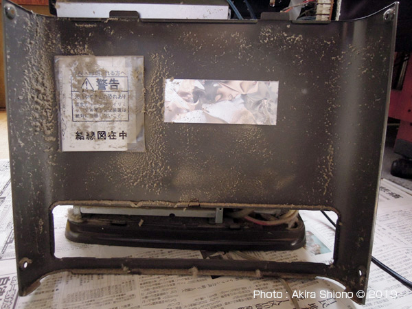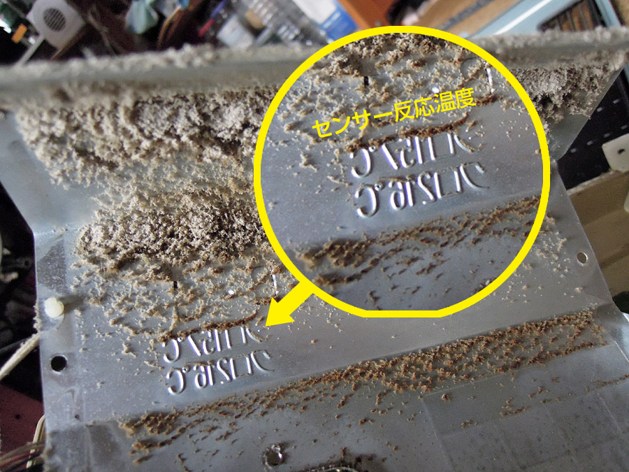 上の画像は、燃焼室の上部の状態です。居間で使用していた(速暖用)ファンヒーターの内部で、薄っすらホコリが積もっています。これらも燃焼時に焦げ臭くなる場合ばありますので、完全に除去します。特に温度センサーのコードが2箇所伸びています。 燃焼停止の原因:キッチンのガスファンヒーター内の油煙を含で積もった綿埃