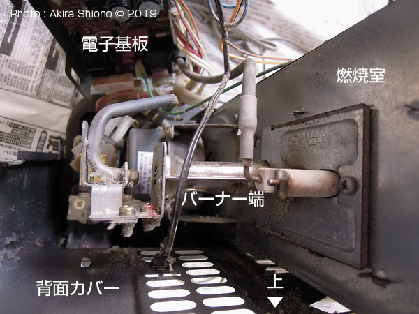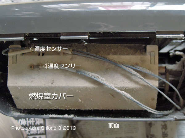 ![]() このタイプの前面の熱風排出口は3つのネジ。燃焼部上には温度センサーらしきものが2箇所留めてあります。 燃焼室の分解 トップへ