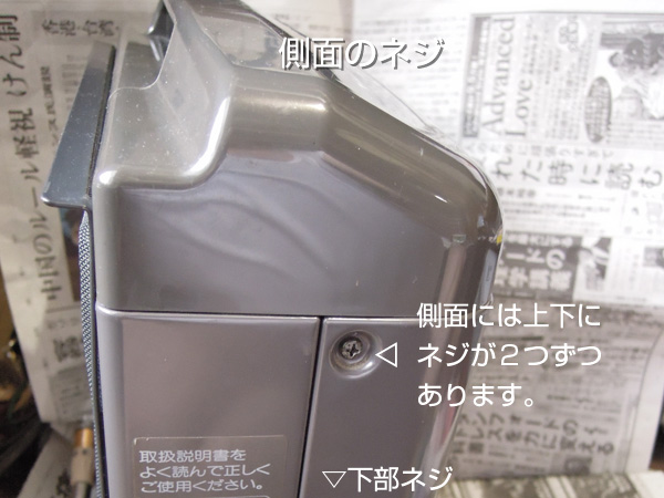 ガスファンヒーターの周りを見回すと、この機種では側面に左右2個ずつ、背面には6箇所、底面にはありませんが上面のコントロールパネル固定用に背面上部に2箇所のネジがあります。気を付けなければならないのは、背面のいくつかにカバーの取り外しには関係ない、内部部品の背面プレート固定用ネジが使われています。これはカバーを外した時に接続状態が分かります。 外側のカバーの取り外し トップへ