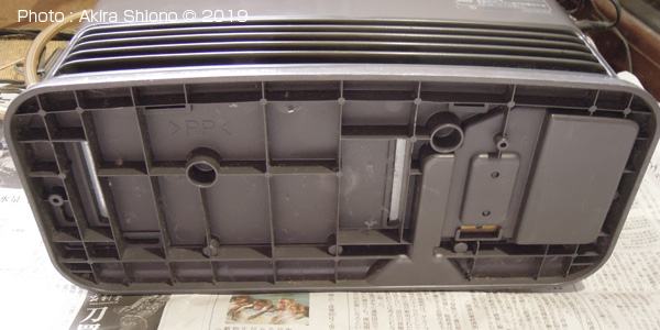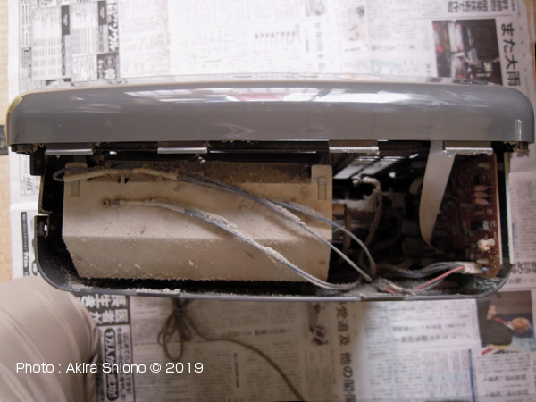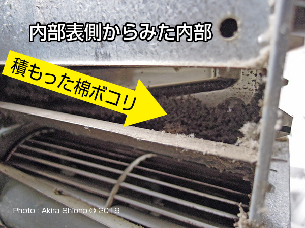 ハンディクリーナーで、こびり付いたホコリを吸い取ります。側面のネジを外し外カバーを外します。 ![]() カバーを取り外した内部前面の構造で、下にシロッコファンが見えます。