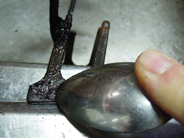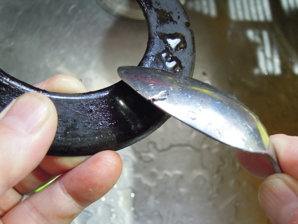 鍋やヤカンの焦げはスプーンの掬う方でガリガリと擦りますと面白いように削れてきます。しかし高温の焼き付きでは簡単にいきません。バーナーリングの表面をスプーンで擦りますが、シンクの縁において上から力を入れて擦れば、だんだん焦げ付きが削れてきます。削れた所はホーロー面が出てきますので、つやのない箇所を削っていきます。ほぼ取れてきましたら、今度は焦げ落とし用のナイロンたわしを下に敷いてスプーンで擦ると早く取れてきます。注ぎ口の狭いところはナイロンたわしとスプーンの柄を組合わせて擦ります。クレンザーを使うとさらに奇麗になります。 ゴトクの焦げとり トップへ
