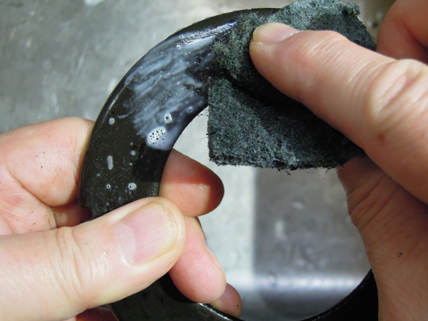 ゴトクは作業しにくい形になっていますが、固定するとやり易くなります。ゴトクのスタンド部分をシンクの縁に面を密着させます。上から押さえるように、スプーンで擦り作業すると比較的ラクに進みます。