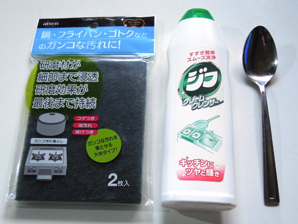 バーナーリングは、バーナーから近い距離にあるので、飛び散ったり吹きこぼれたりしたものが焼き付き頑固な汚れになります。ここに用意してあるのは、左から『ガンコな汚れ落とし』、『クリームクレンザー』、『大きめのスプーン』の3つです。 頑固な焦げ落とし製品を見る