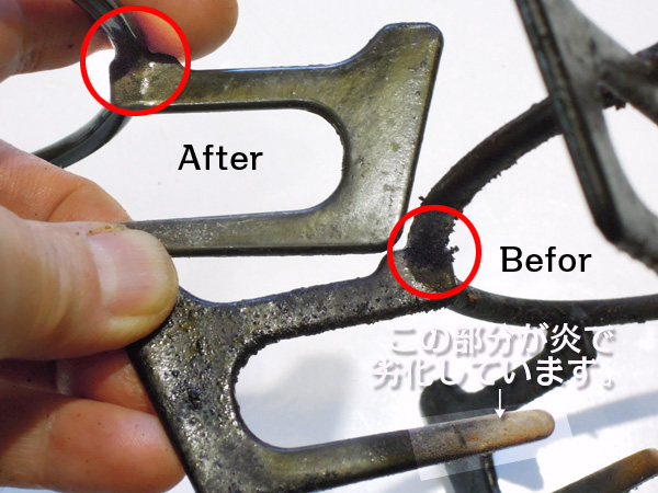 調理器具は毎日手入れをしていないと、焼き物や、揚げ物等の油が飛び散っていたりで、ガステーブルの火の近くの部品は焼け焦げて黒くなってきます。左のバーナーリングの様に、真っ黒焦げに分厚くなった物はかなり頑固で、焦げ落とし専用のナイロンたわしでも、なかなか落ちてくれません。 コゲ落としに必要なもの トップへ