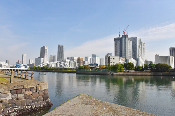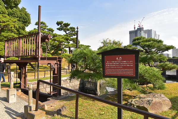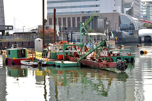 ![]() 左ー浚渫船が停泊している横堀沿いは、東京湾の潮の香りが漂います。横堀と池の間には江戸時代からと思われる松があります。