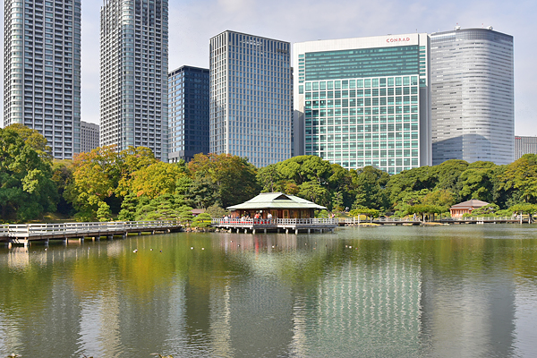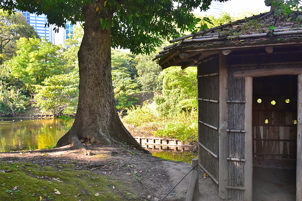 ![]() 大泉水も潮入りの池で海水が流れ込む。奥には東京タワーが顔を出す。 中島の御茶屋 トップへ ![]() 大泉水(潮入の池)の対岸から見る中島の御茶屋で、後ろには高層ビルが林立しています。