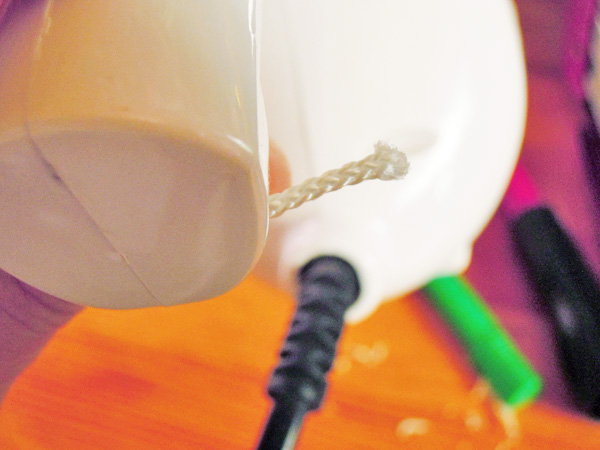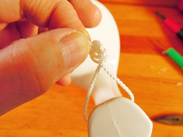 通す素材は、金属製の針金などでは、繋ぎ合わせ箇所で怪我をする恐れがありますので、丈夫なヒモにします。今回は、ブラインドコードが手元にありましたので、これを使用します。