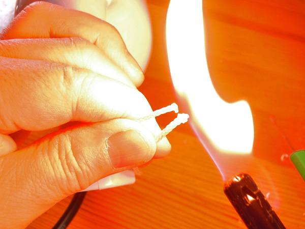 取り付けたコードの処理 トップへ 組紐などのコードは、編んである為にそのうちにほどけて房状になってしまいます。これを防止するために端を炎で溶かします。写真は着火器で炎が大きく危ないので、炎が小さくなるように調整してください。(レーヨン製は溶けませんので、セメダインなどで固めます)両端の長さを均等に合わせ2本一緒に結ぶか、八の字結びにします。 |
