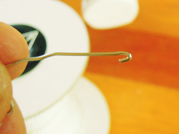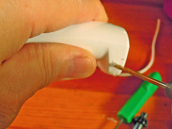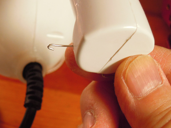 ヒモは柔らかいので、そのままでは通りませんので、ゼムクリップの端をラジオペンチ等で曲げてフックを作ります。ゼムクリップを伸ばして判定側の穴から先端部分のフックを出します。そこにコードを引っ掛けて引き抜きます。