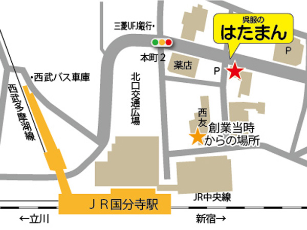上の写真は、昭和36年頃に国分寺駅北口の商店街を撮り続けた田中丈夫氏の写真です。先述しましたが、ここは国分寺駅北口駅の北に向かう大通りと最初に東西の道の交差点少し入った東に向かった写真です。ここで取り上げる「呉服のはたまん」は左にあります。 この機萬呉服店の創業は明治24年(1891)です。初代の内野松五郎が、明治22年に開業したばかりの甲武鉄道(現中央線)の国分寺駅前に出店するため、武蔵村山の中藤より出てきたのが始まりです。以来、国分寺市内はもとより、周辺各市の多くのお客様に支えられ、企業統制によって閉店を余儀なくされた戦中、戦後の苦しかった時代も乗り越えて、今年で120年を迎える事が出来ました。< 出店した明治24年頃は現在の北口駅前の道路は無く、当店があった現在の西友の前の道が府中に向かう唯一の道路(旧国分寺街道(P.3参照)でした。道の東奥には中央線を渡る踏切があり、それを渡ると岩崎別荘(現在都立殿ヶ谷戸庭園)の東側に府中に向かう道が続いていました。 昭和30年頃から徐々に着物ばなれが始まり、また40年代に入ると商店街自体のお客様も減少してきましたので、ビルにして西友をテナントとして1階の西側に店を置くことにしました。 平成13年には西友の中の店はスターバックスにお貸しして、北北東の駐車場に近い現在の場所に移ってきましたが、明治からの客様の中には、お子様、お孫様、曾孫様と四代に渡ってごひいきにしていただいている方もいらっしゃいますので、本当に有り難いと思っております。 CHSのIROIROサイト:人気サイト トップへ |