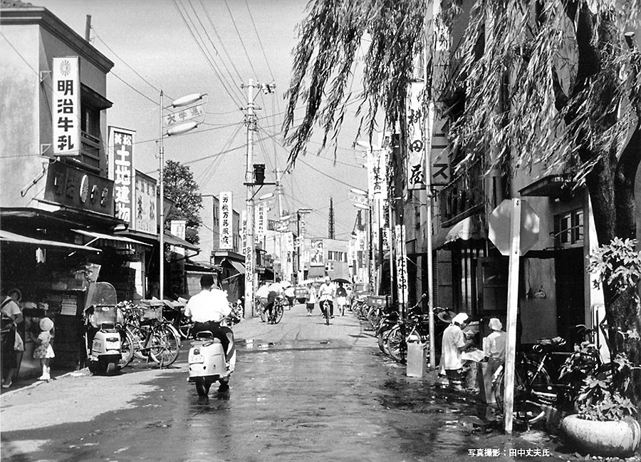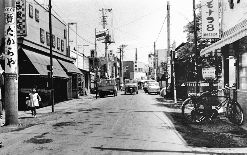 甲武鉄道時代の国分寺駅開設後5年後(1894)には、川越鉄道が開業しました。この様に国分寺駅北口は人々が集まり、国分寺駅北口は商業が盛んになりました。 さて、上の写真は昭和36年頃に田中丈夫氏が撮影した、国分寺駅前交差点の東側の写真です。街路灯には「大学通り」の文字が見えますが、現在は南口から通学する学生さんがほとんどですが、南口が開設される前からあっので、この通りが東京経済大学の通学路であった名残です。当時は、自動車はほとんど貨物車やミゼットなどの軽トラックで自家用車豊かな人だけの物で普及していませんでした。ここで目に付くのはラビットスクーターや自転車が移動手段のほとんどでした。この当時は広さに余裕がある様に見えますが、その後モータリゼーションが広がると、とても危険な道になってしまいました。こんな風にのんびりとした時代で、現在豊かなものを沢山失っている様な気がします。 大学通りの老舗はたまん トップへ