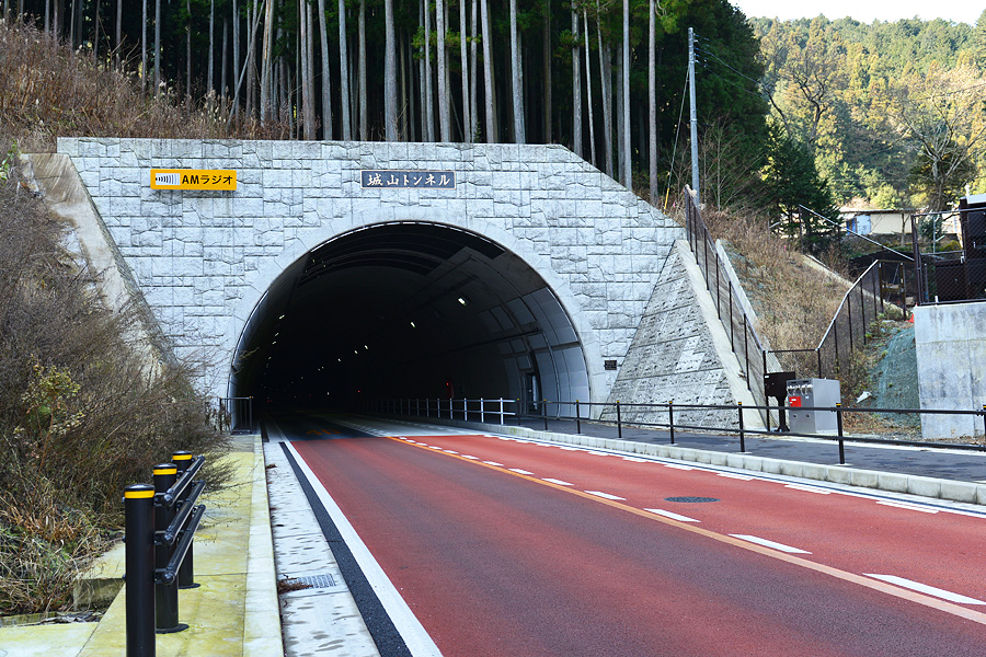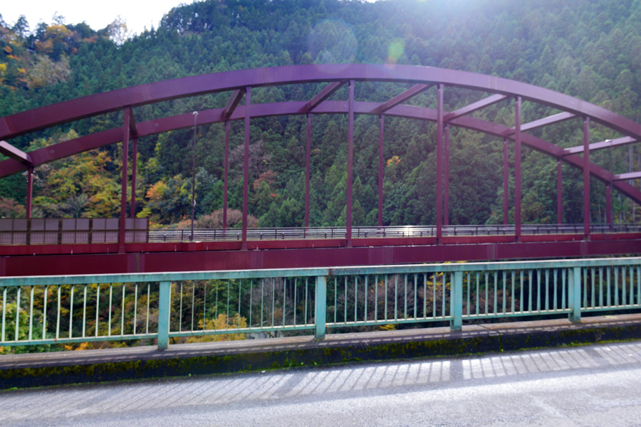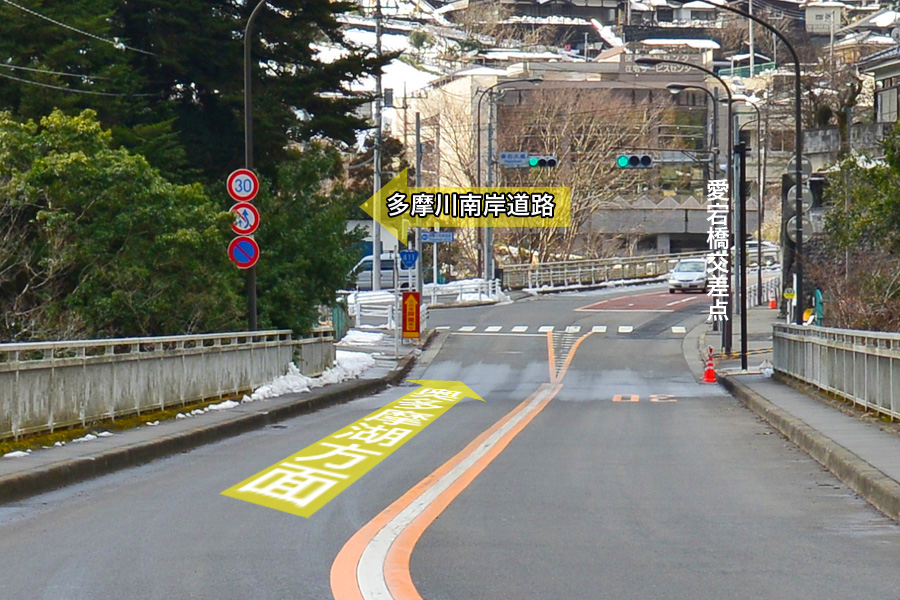 鳩の巣大橋の東側の入口と鳩の巣大橋の東側の入口からの景色で、先は左側にカーブしています。