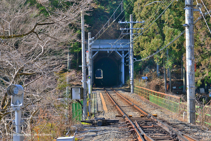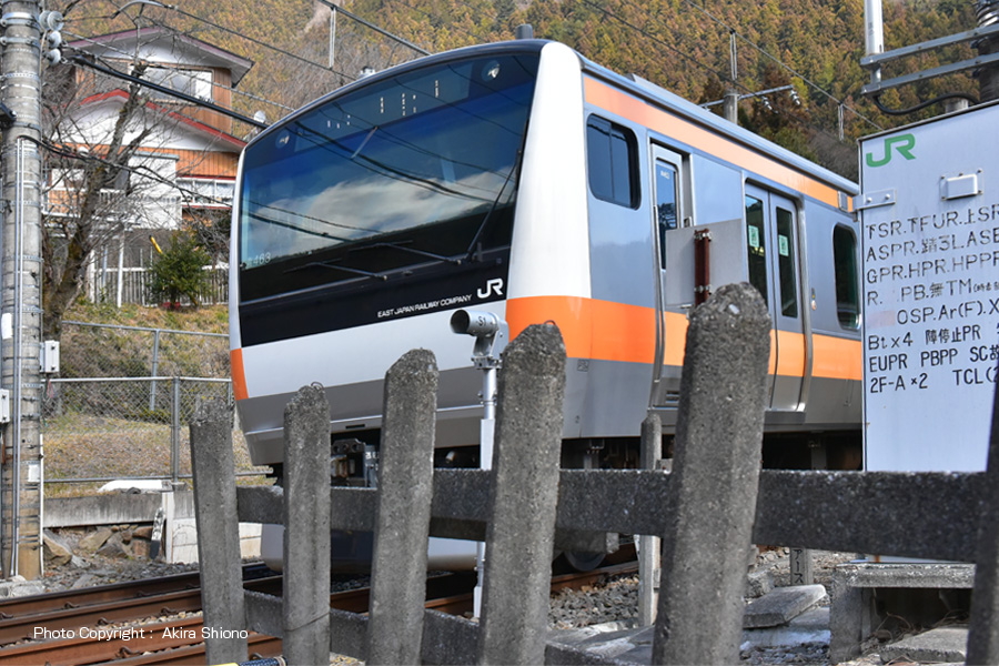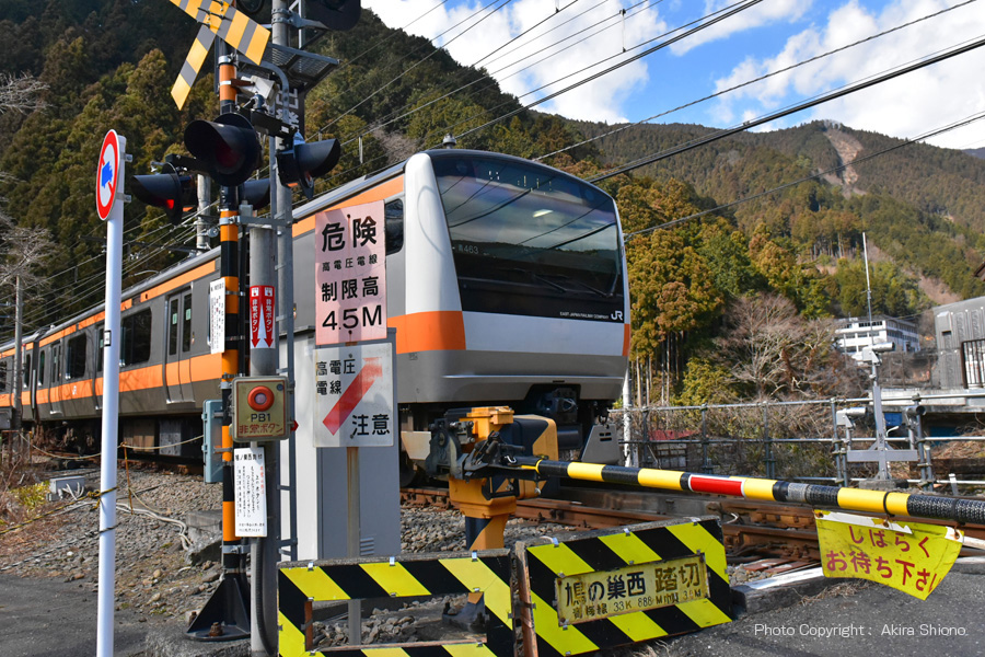 鳩ノ巣駅西側にある鳩の巣 西踏切と青梅線。鳩ノ巣駅を出発した青梅線の車両
