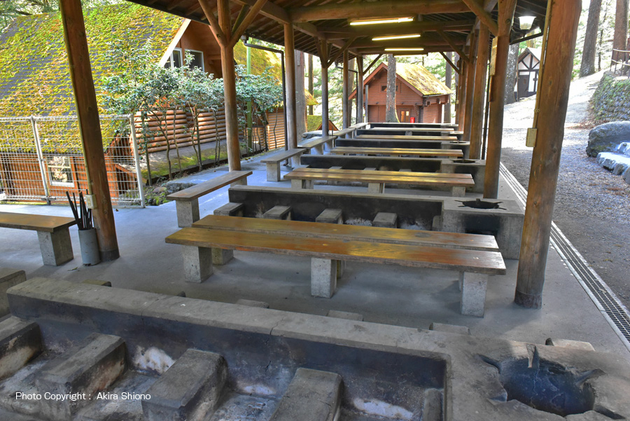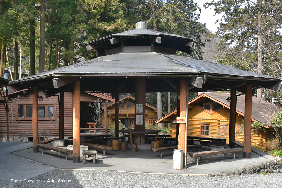 氷川キャンプ場は、奥多摩駅からのアクセスは、青梅街道の奥多摩駅入口の信号を直進して多摩川に架かる『昭和橋』を渡り、しばらく進むと左手にキャンプ場駐車場・入口があります。エリアは、この昭和橋の下流から、もえぎの湯へとつながる『もえぎ橋』の間の右岸になります。 ![]() 団体に最適な円形のクッキングスペース