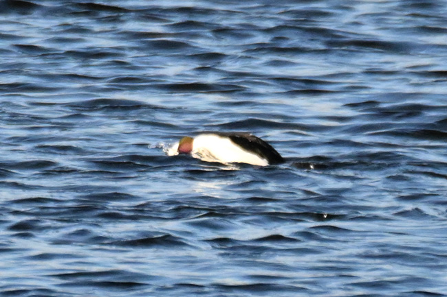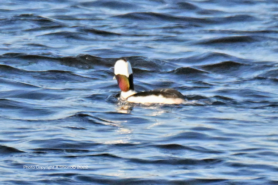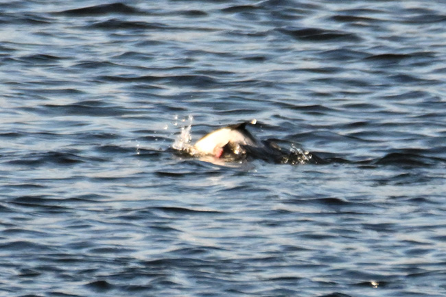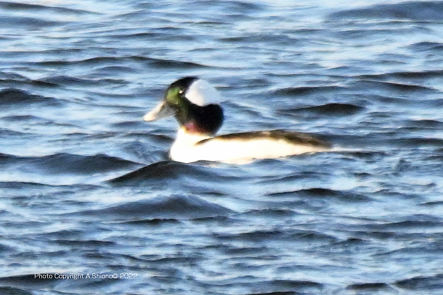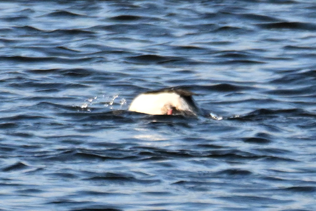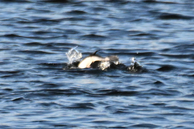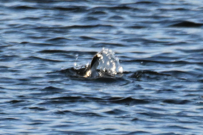 ヒメハジロ撮影に最適と思われる一番近いポイントには、すでに数人のカメラが入っていて入っていました。少し手前からヒメハジロまでの距離は50m程度ありました。そんな事で画像が荒れるのを覚悟で、離れた場所から撮影することにしました。 ![]() 多摩川の中流域で棲むヒメハジロのオス ※荒れますがクリック拡大可 ![]() ちょうど傾きかけた陽を浴びるヒメハジロのオス ※荒れますがクリック拡大可 撮影:NIKON Z9I+FTZII+TC-14EIII+AF-S200-500mmE f/8 DX:Lサイズ1050mm ISO 2500 1/4000 f8 0段 ![]() ヒメハジロのオスの後頭部は両頰の白が後ろで繋がった模様になっています。 撮影:NIKON Z9I+FTZII+TC-14EIII+AF-S200-500mmE f/8 DX:Lサイズ1050mm ISO 2500 1/4000 f8 0段 ヒメハジロのオスの水中ダイブの連写 トップへ 下の連続撮影は、1050mm望遠の画像の中央部を更に拡大トリミングしていますので、かなり画像が荒れています。※被写体が小さいので等倍まで拡大すると、レンズがプロ用の様に性能が高くないのと、1.4xテレコンも接続してあるので、鮮明度がかなり下がっています。 ヒメハジロのダイブの6コマ送り 撮影:NIKON Z9I+FTZII+TC-14EIII+AF-S200-500mmE f/8 DX:Lサイズ1050mm ISO 2500 1/4000 f8 0段 コマ送りで動画作成 移 動: 水辺の野鳥:ヒメハジロ 都内では珍しい「ヒメハジロ」 ヒメハジロの模様 ヒメハジロの水中ダイブの連写 リンク: 多摩川の野鳥たち/シラサギ トビの飛ぶ顔 トビが鮎捕獲 トビが蛇の奪い合い トビが野鳥捕獲 野鳥サイト(106種) 野鳥分類別サイト 野鳥サイトリスト版 その他のカメラとレンズ トップへ 一眼カメラと望遠レンズを探す ご興味の方は、下のamazonのリンクで製品の評価などを見れます 双眼鏡・フィールドスコープを見る