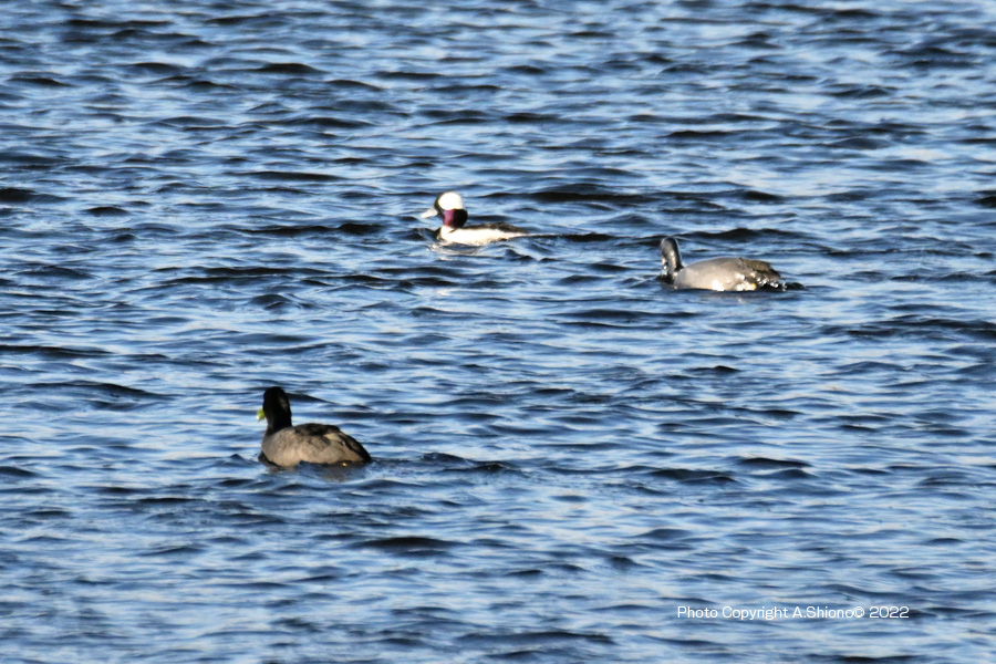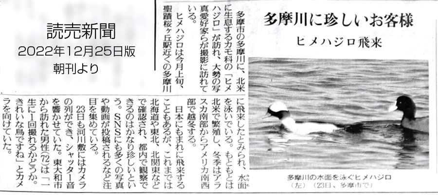 ヒメハジロは、カモ目カモ科ホオジロガモ属ヒメハジロという分類です。マガモやカルガモ等のカモ類は水中の草などを逆立ちして食べるのに対して、この属は下に写っているオオバンやカイツブリの仲間の様に水中に潜って餌を取ります。食事中の時は2秒ほど息を吸って即水中へ潜るを繰り返しますので、シャッターチャンスが難しい水鳥です。 都内では珍しい「ヒメハジロ」 トップへ 読売新聞の記事のヒメハジロ出現場所に行って、この水鳥を探すことにしました。場所がわからなかったので、駐車場から川沿いを上流に向かって1km程歩いて探すことにしました。途中お散歩されている年配の方にお聞きして、該当しそうな場所に向かうことにしました。この辺りの河原はとても広く、水辺にはシラサギやカワウなどを所々で目にしましたが、なかなか出会うことができません。カメラを取り付けている三脚を担ぎ途方に暮れていると、そばにお住まいの親切な女性から「ヒメハジロを探していますか?」と尋ねられました。 ここは毎日の散歩コースの様で、特徴のある鳥なのでいつも楽しみにご覧になっている様でした。その方からいる場所を親切に教えていただきました。記事にはオオバンと一緒に写っていたのを思い出し、さらに先に進むとオオバンの群れに出会いました。その中に午後の陽に照らされた白い頭部の水鳥を発見しました。 ![]() 多摩川の中流域で複数のオオバンと群れになっていたヒメハジロ 撮影:NIKON Z9+FTZII+TC-14EIII+AF-S200-500mmE f/8 DX:Lサイズ1050mm ISO 2500 1/4000 f8 0段 ヒメハジロの模様 トップへ