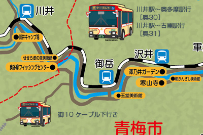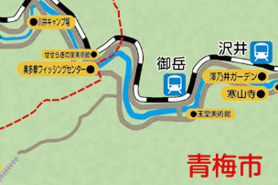 JR青梅線沢井駅から御岳駅のエリアは青梅エリアで最も人気の観光地です。沢井駅側には小澤酒造、沢能ガーデン、ままごと屋があり、御岳駅近くには御岳渓谷、玉堂美術館があります。また御岳山の玄関口で、バスの停留所は山へ向う人々でにぎわいます。