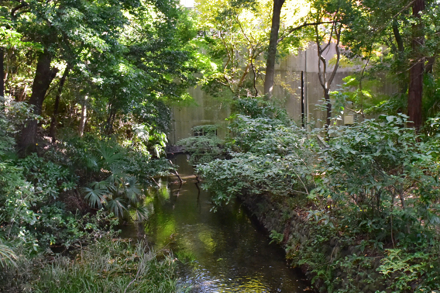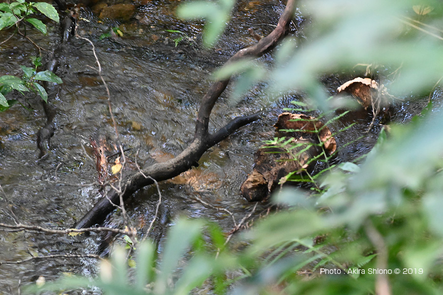 園内の所々から湧き出た清水が集まり沢の様になって流れます。台風の影響か太い枝が沢に落ちています。