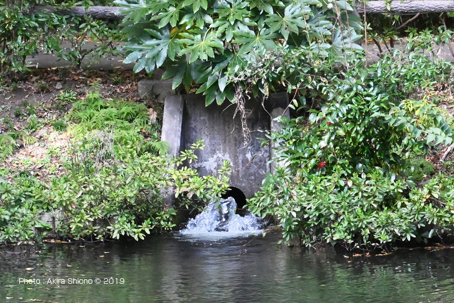 ここ日立製作所中央研究所にある「大池」は、国分寺市内では最大の池です。日立中研の中庭から大池の位置には国分寺崖線の高低差があり高台の地面に染み込んだ雨水が地面に吸い込まれ時間をかけ濾過をされ所々から清水として湧き出しています。この大量の水は一旦大池に溜まり、南側の水門から流れ出ます。その後西武国分寺線と中央線の線路の下を潜り、一里塚方向へと流れて行きます。これが野川の源流となっています。 湧水と池からの流れ込み トップへ