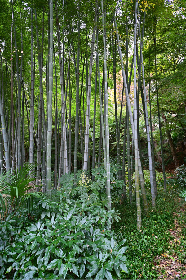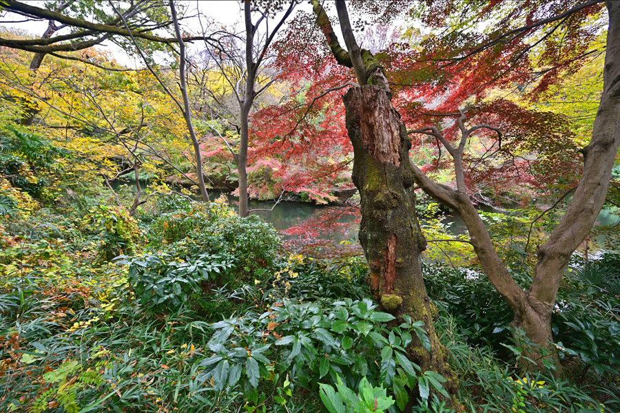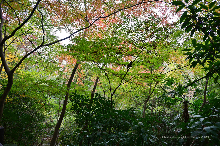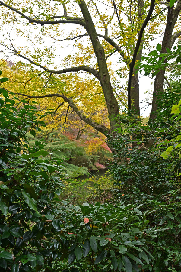 庭園を奥の大池東側に向かう坂下で各樹木が綺麗に色付いていました。