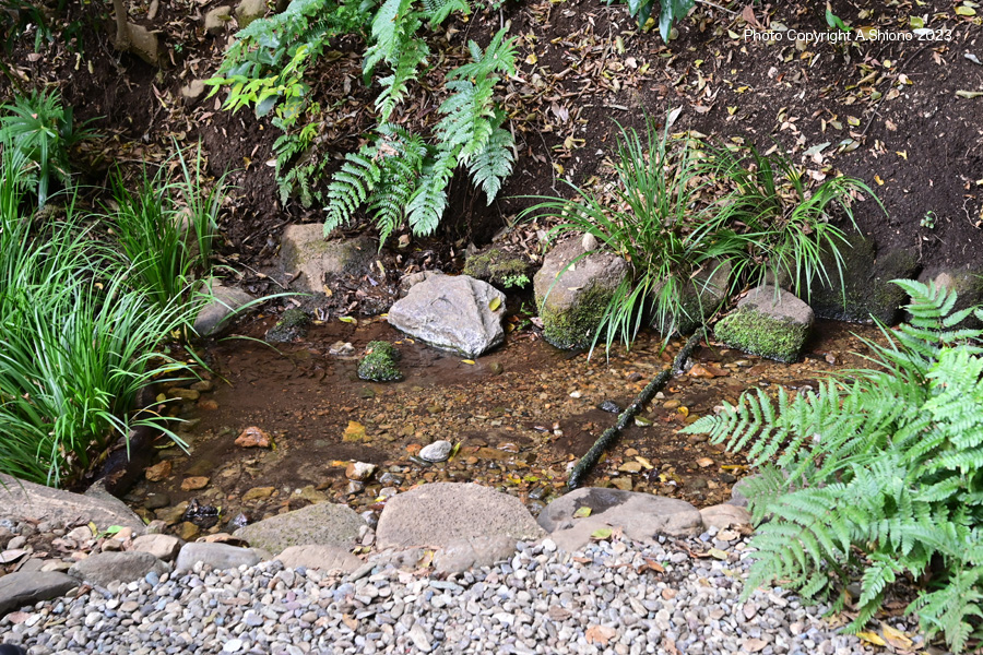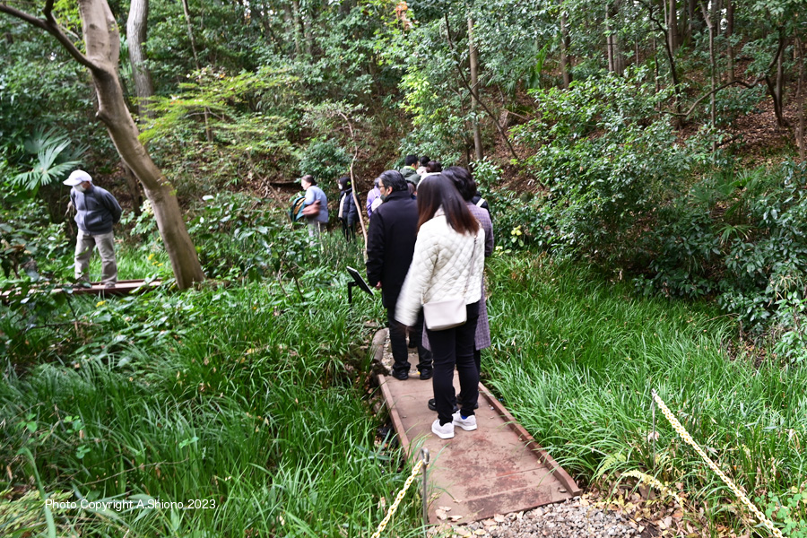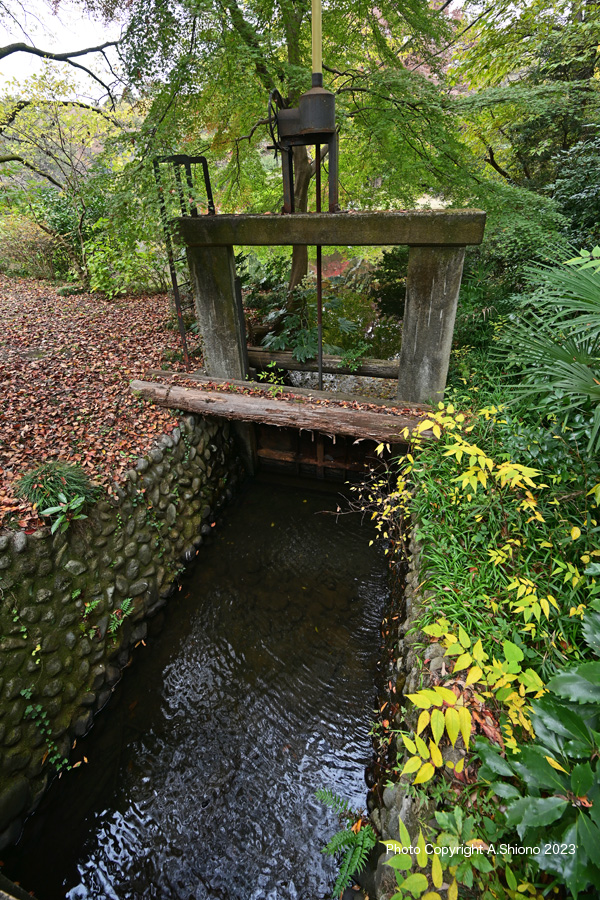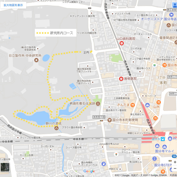 上は当日配布されたパンフレットは今年フルカラー版になり、とても見易くなりました。「日立製作所中央研究所」内の地図で北が右になっています。この研究所の面積は約1万㎡あり、研究所の南側(中央線の線路側)には周囲約800m、深さ1〜1.5mの『大池』があります。この池には、研究所内に降った雨水が高低のある差地形から浸み出した複数の「湧水」が流れ込んでいます。この東西二つに別れている大池は、水路で繋がれています。この辺りに橋があり、南岸へ向かうことができます。橋を渡りきった先は、大池の東側を周る小径と接続します。さらに西へ進むと池の水門があります。湧き出た水は池を通ってここを通り中央線の下を潜り野川となって三鷹方面へと流れてゆきます。