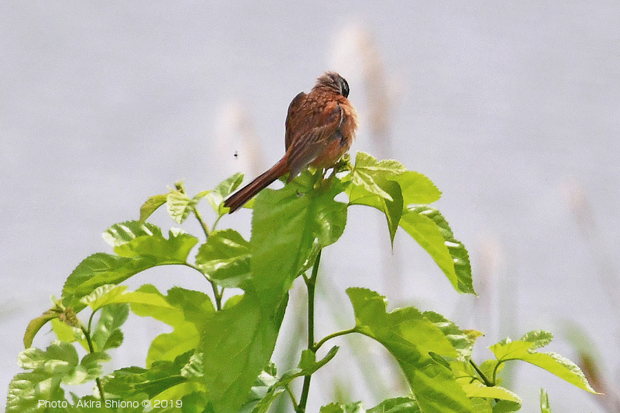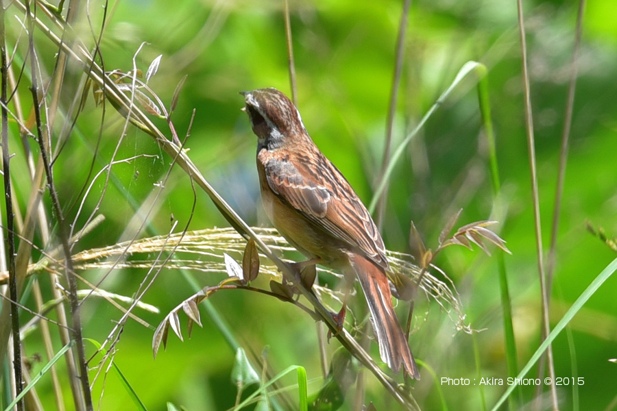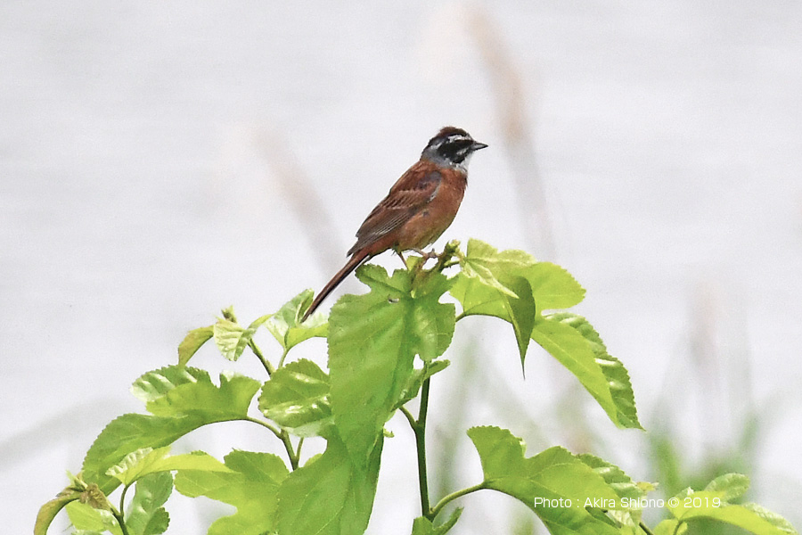 多摩川中流部の広い河原の草に留まるホオジロ。