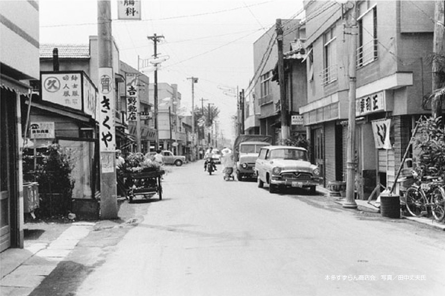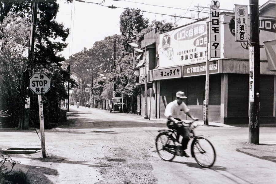 この写真は、昭和30年代の本多二丁目交差点の連雀通りを西に向かって写したものです。 この時代では自家用車は殆ど目にすることはなく、商業車のライトバン、トラック、ミゼットの様は小さな貨物位でした。こんな交通状況だったものですから、交差点には一時停止の標識がありました。ここに写っている標識は、現在の三角形の「止まれ」と書かれている赤い標識ではありませんでした。昔の一時停止の標識は八角形で、米軍占領下だった為にアメリカで使われていたこの形が使われたと思われます。この柱には、「東京都公安委員会」の文字があります。しかし上の写真では、標識柱が木の様に見えますが、こちらはしっかりした素材にみえます。また、表記が中央のSTOPが「止まれ」に変わっていて時代の移り変わりを感じます。また、上の写真よりも交通量が幾分多く見えます。当時の本多二丁目交差点の北東角には、少し前まで現存していた「飯田米穀店」(現ファミリーマート本多5丁目店の場所)が見えます。今は決して広くない連雀通りがとても幅広く見えます。 昭和30年代の本多二丁目交差点北 トップへ こちらは、みにこみ国分寺33号の「国分寺 今・昔」に掲載された本多二丁目交差点の北側の商店街です。撮影は昭和36年頃です。交差点にはまだ信号機が付いていませんが、「トヨペット・マスターライン」や商業用のトラックが見えます。交差点を横切るのはパブリカの様に見えます。正面から中型のオートバイがみえますが、この当時はヘルメット装着の義務はありませんでした。左手には今は目にすることがない「リアカー」が見えますが、当時は自転車で引いている光景をよく目にしたものです。 |
