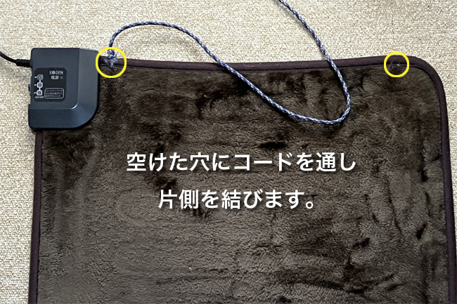 ホットミニマットの片側にヒモを通して結んでおきます。この紐の長さはデスクチェアーの背に回して見て余裕を持った結ぶ部分の長さが必要です。 移 動:滑り落ちるホットミニマット対策 マットの固定方法 ここで使う用品 ホットミニマットにヒモを取り付ける デスクチェアーに取り付ける リンク: 廃電気製品からコードを再生 裂けたビニール傘修理 厚手ビニール製品の溶着 修理部品と工具を見る