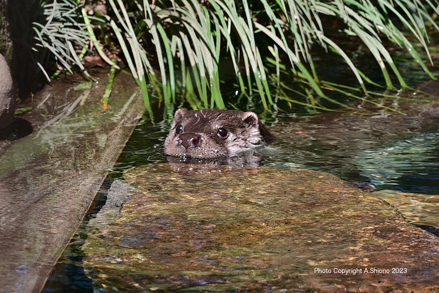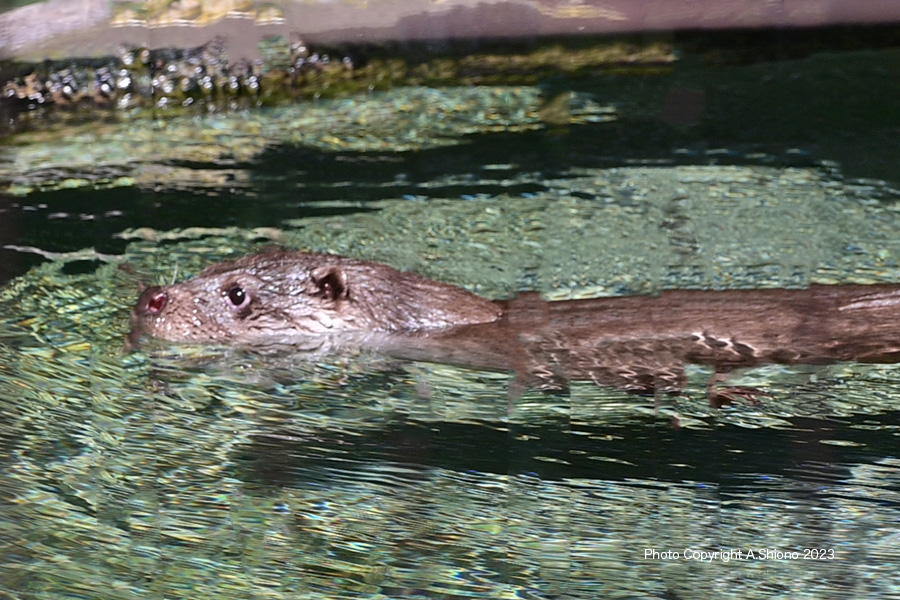 飼育員がお手入れに入ってきたので、水中に逃げ込みました。 撮影:NIKON Z7+TAMRON 70-300mm f-4.5-6.3 f/9 FX:Lサイズ207mm ISO 140å 1/100 f/13 -0.3段 手持ち撮影 身近な動物(家畜) トップへ