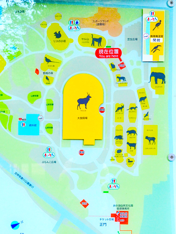 井の頭自然文化園は上野動物園、多摩動物園、葛西臨海公園、大島公園動物園と5つある都立動物園のうちの一つです。立地は武蔵野市のJR吉祥寺駅の南側にある井の頭公園の西側にあります。場所はJR吉祥寺駅の西口の吉祥寺駅前信号交差点から南に伸びる吉祥寺通り添いにあります。この吉祥寺通りをはさみ東に水生物園はあります。 井の頭自然文化園のお話 トップへ 井の頭自然文化園は井の頭恩賜公園の一角にある都立動物園です。戦時中の昭和17年(1942)5月17日に開園しました。それに先立って昭和9年(1934)には中之島に小動物園が、昭和11年(1936)には水生物館(日本初の淡水魚専門の水族館)がいまの水生物園(分園)に開設されており、それらが母体となって誕生しました。動植物の観察公園として幅広い年齢層に親しまれています。面積は動物園(本園)8.25ha、水性物園(分園)3.3ha。(井の頭自然文化園パンフレットより) 動物たち トップへ