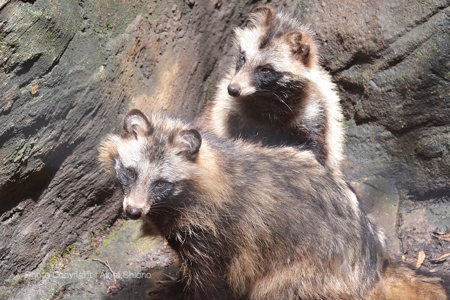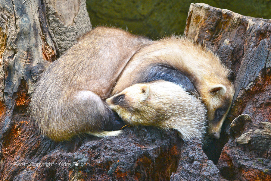 左ーホンドギツネはキタキツネに比べると尾が細い 右ーアナグマは夜行性なのか熟睡中