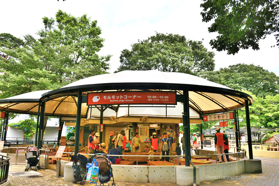 左ー入口に近い場所にあるモルモットコーナは幼児に人気でした。右ーホンシュウジカは夏毛に生え変わり中でした