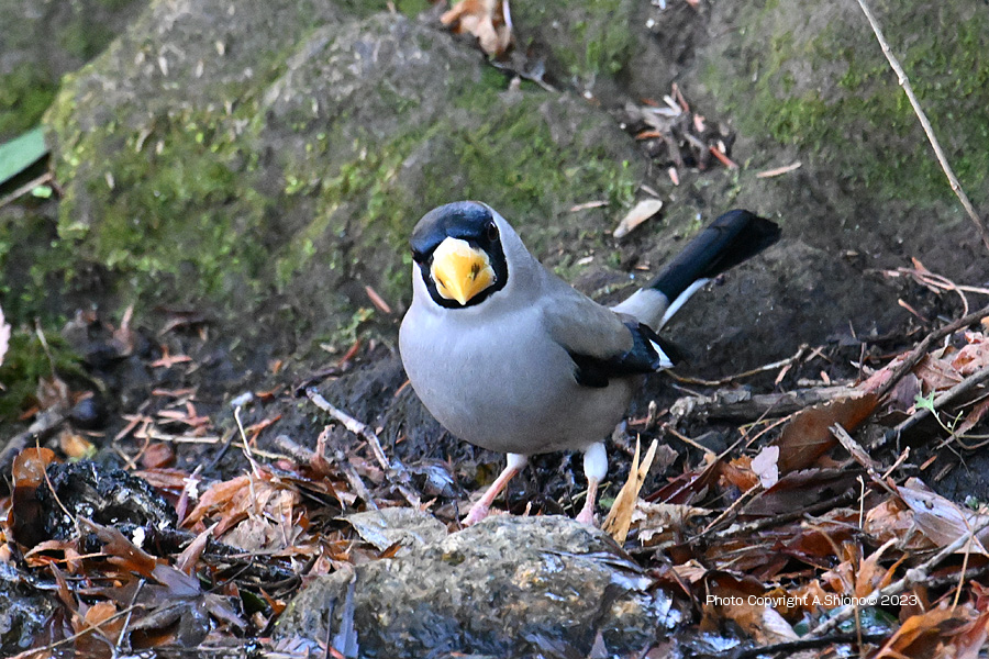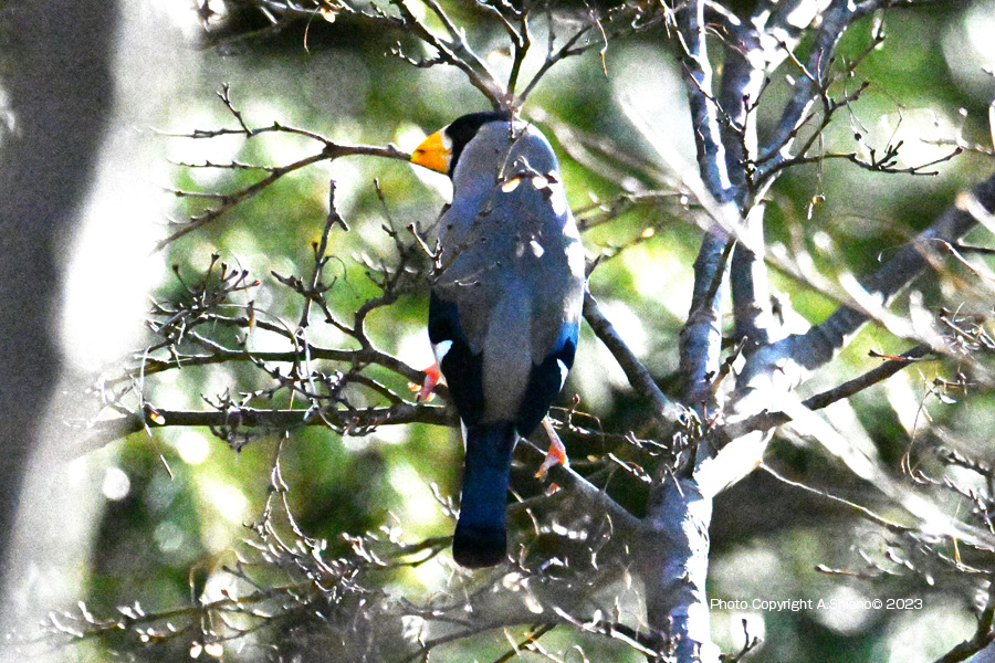 イカルはシメやカワラヒワと同じスズメ目アトリ科の野鳥です。形もかなり似ています。カワヒラは茶っぽいオリーブ系に黄色・黒・白の色が入っています。このイカルは灰色系の体で顔部が黒く羽先が黒く白っぽい帯が入っています。尾羽は黒と青の2色になっています。クチバシはカワラヒワやシメと違いオレンジ色でふた回りくらい大きく顔側が白い縁になっています。野鳥は小さいものは14cm〜60cm弱の物がいますが、このイカルはよく見かけるスズメより2周りくらい大きい、全長が約23cm位と中程度でヒヨドリに近い大きさです。 3月中旬の多摩丘陵のイカル 2025.3.15 トップへ