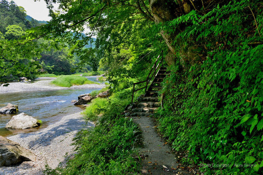 軍畑大橋から西に約470先に御岳渓谷遊歩道の入口があります。JR青梅線を利用した場合、JR軍畑駅で下車して急坂を下ると軍畑大橋傍に出ます。ここから青梅街道を川に沿って澤井方面へ上るとガードレールが切れた箇所にこの入り口があります。 楓橋から軍畑方面へ ▲top 軍畑の入口から楓橋まで続く遊歩道のエリアは、こ自然が多いエリアで、始めのうちは 木立の間に通っている遊歩道という感じですが、中間エリアは一気に景色が広がります。右側の高い位置には、青梅街道が通っているためこのエリアは自動車の騒音がダイレクトに聞こえてきます。景色が開けて上を覆う木々が無く草木ていどですので、梅雨明けからの暑い時期には、日よけ対策が必要となります。 軍畑〜楓橋の野鳥と昆虫 ▲top