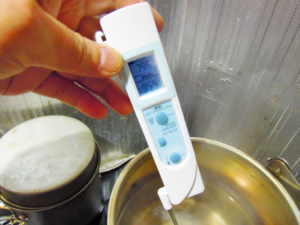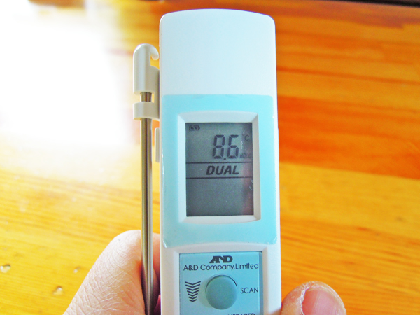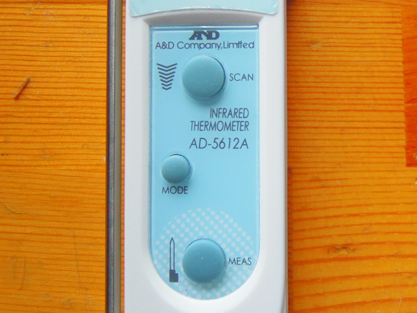 [非接触表面温度測定]この機器自体特殊な計測器なので、操作が難しそうな気がしますが実はとてもカンタンです。右下に操作ボタンが写っていますが、非接触表面温度測定(離れた場所の計測)では、SCANボタンを押すだけです。計測結果は瞬時に表示されます。 [中心温度測定]