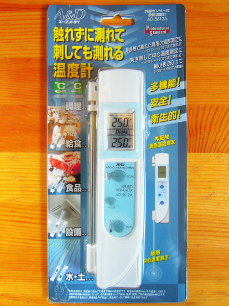 心地よい季節ではあまり気にもしませんが、真冬や真夏は寒気や熱気を部分的に感じる事があります。この場所を特定し対策する事により、より一層の省エネに繋げられると考えています。普通の室内温度計では計測までに時間がかかりますので、数多くの場所を探すのに時間が掛りそうです。そこで離れた場所を瞬時に測定出来る温度計がありましたので、ご紹介いたします。 便利な使い方 トップへ 各所温度計測機器の便利なとことは、冬では部屋の各部の温度測定ですきま風の位置がわかったり、部屋の温度分布でエネルギーを効率よく使えたりします。また、意外に良かったのは缶飲料の湯煎の温めで、直接口に当たる物なので60℃くらいと言われています。この機器を向けてボタンを押すだけで計測できます。 本体と操作ボタン トップへ 本体の左側には、内部温度測定センサーがあり、下の写真のように反対側に伸ばして使います。非接触表面温度計測では、本体上にある計測部を計測対象箇所にあてて計ります。 料理にも使える中心温度測定と、非接触表面温度測定 トップへ