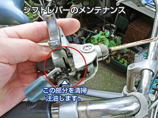 自転車の使用が頻繁で、雨中走行している場合長期間になると各部のオイル切れが起こります。チェーンの場合はペダルと踏むたびに「キリキリ・キリキリ」と音が出る場合があります。この場合は、チェーンの油が切れて金属同士が錆びて擦れ合う音です。 今回は、レバーの戻りが悪くなったのに加えて、高いギアに変速すると突然元のギアに音を立てて戻ります。走行中ですのでバランスを崩す可能性もあり、走行しにくくなるだけでなく転倒の危険性もあるかもしれません。 今回は比較的簡単なメンテナンスをして、以前の様に快適な変速に戻す事を目的とします。しかし10年以上使用している自転車の場合は、内装3段変速機の内部のメンテナンスが必要になる場合もあります。この時は内部構造が複雑なため、技術のある専門店にお願いするようになりますが、調整で治る場合がほとんどです。 内装3段変速機のレバーと本体 トップへ