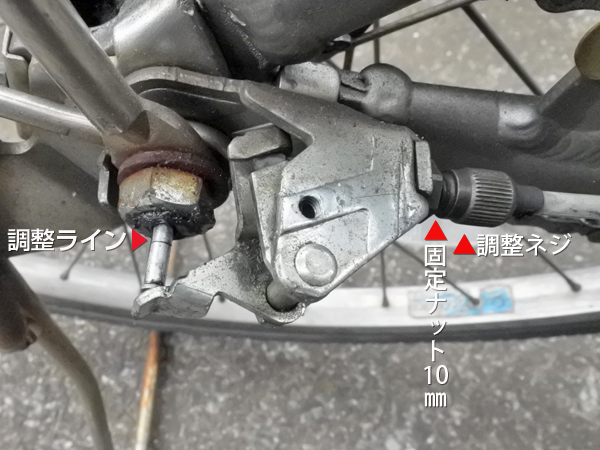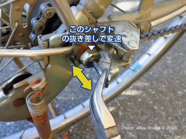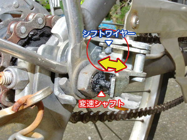 変速トビの原因は、後輪側にある変速機のワイヤー調整にあります。ハンドル側から来た変速ワイヤーは、変速側にある調整ネジを通ってカムによって本体の変速シャフトを押す構造になっています。このシャフトには、よく見ると線が引かれています。